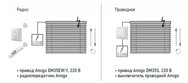 Для реализации группового проводного управления горизонтальным жалюзи 50 мм с одного выключателя необходимо использовать Реле групповое DС516 на 4 привода 220 В, к которому изделия подключается напрямую. При этом в качестве устройства управления может использоваться любой проводной выключатель Amigo 220 В.