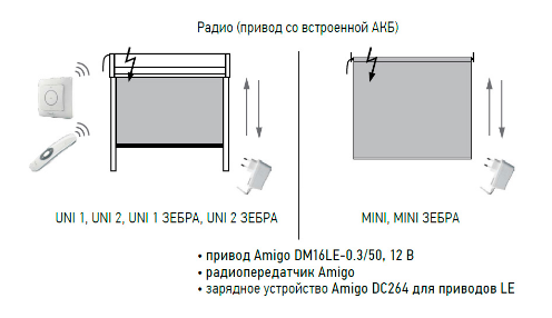 Привод Amigо DM16LE-0,3/50, 12 В, используемый для моторизации UNI и MINI, помимо встроенного радиоприемника имеет также встроенную АКБ. Установка данных рулонных штор не требует прикладывания проводов. Батарея заряжается от зарядного устройства аналогично мобильному телефону.